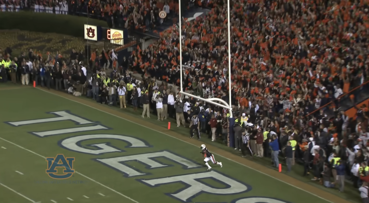 Watch as Chris Davis returns a missed field goal the length of the field at Jordan-Hare Stadium.