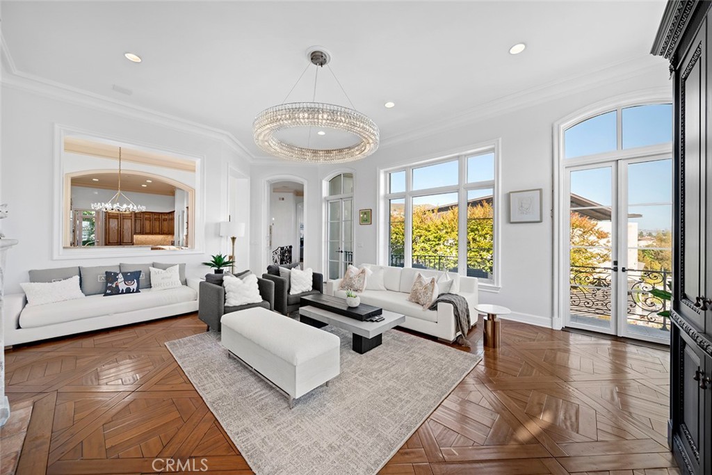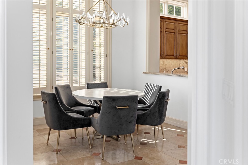 The living room offers an inviting space with beautiful ocean views, while the adjacent patio provides a peaceful setting to enjoy the scenery. A formal dining room connects seamlessly to the chef's kitchen, which features high-end appliances and generous counter space, ideal for both everyday living and entertaining.